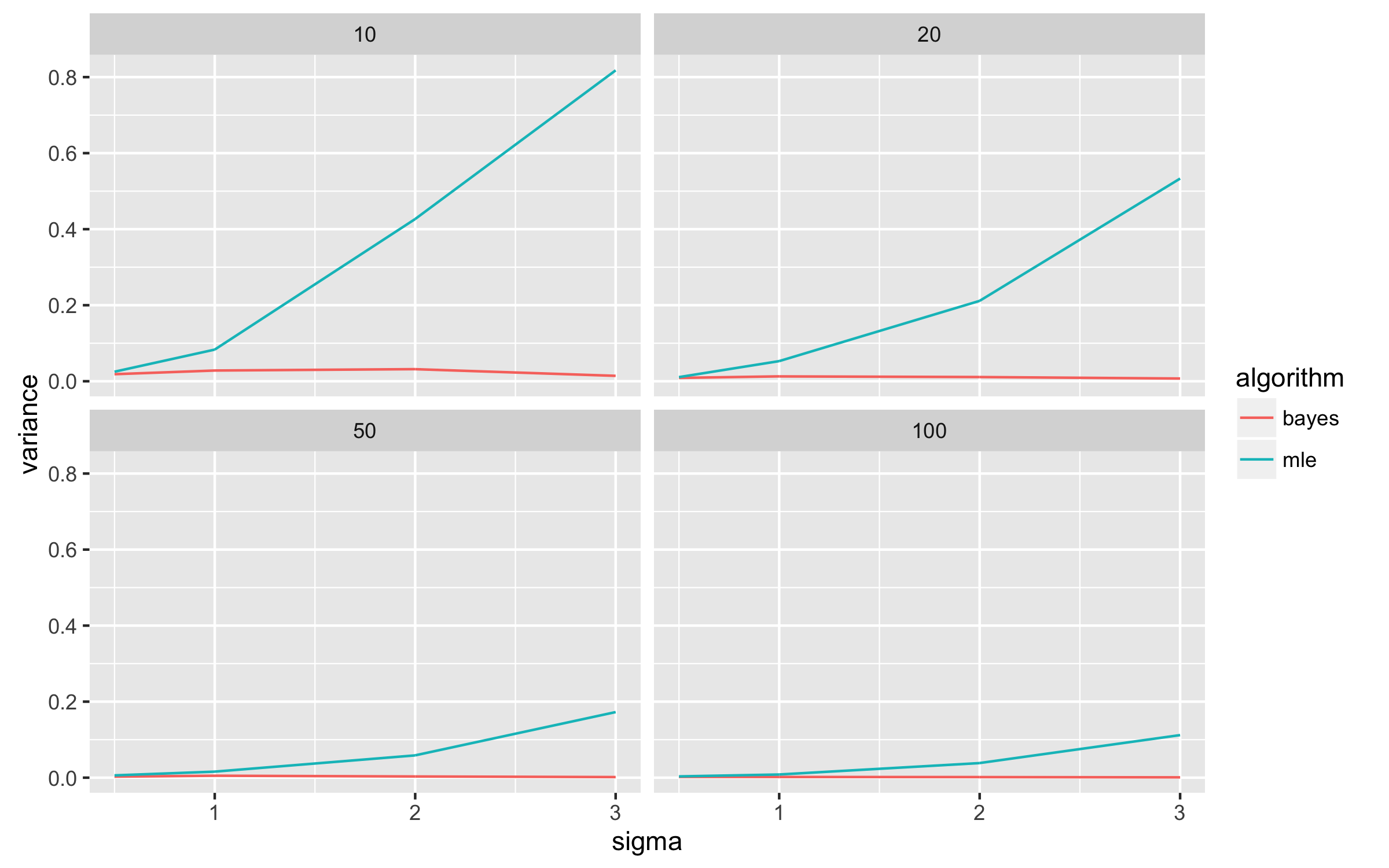 ggplot(results, aes(sigma, variance, color = algorithm)) + geom_line() + facet_wrap(~ n)