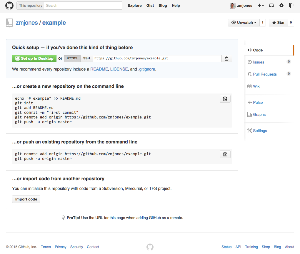 As an example I've created a remote repository called example.You should do the same (skip to the next two sections to see how to do this). Add a README and a LICENSE via GitHub when doing this. In all the remaining code substitute my username zmjones for yours. You'll see a screen that looks like the one below.
