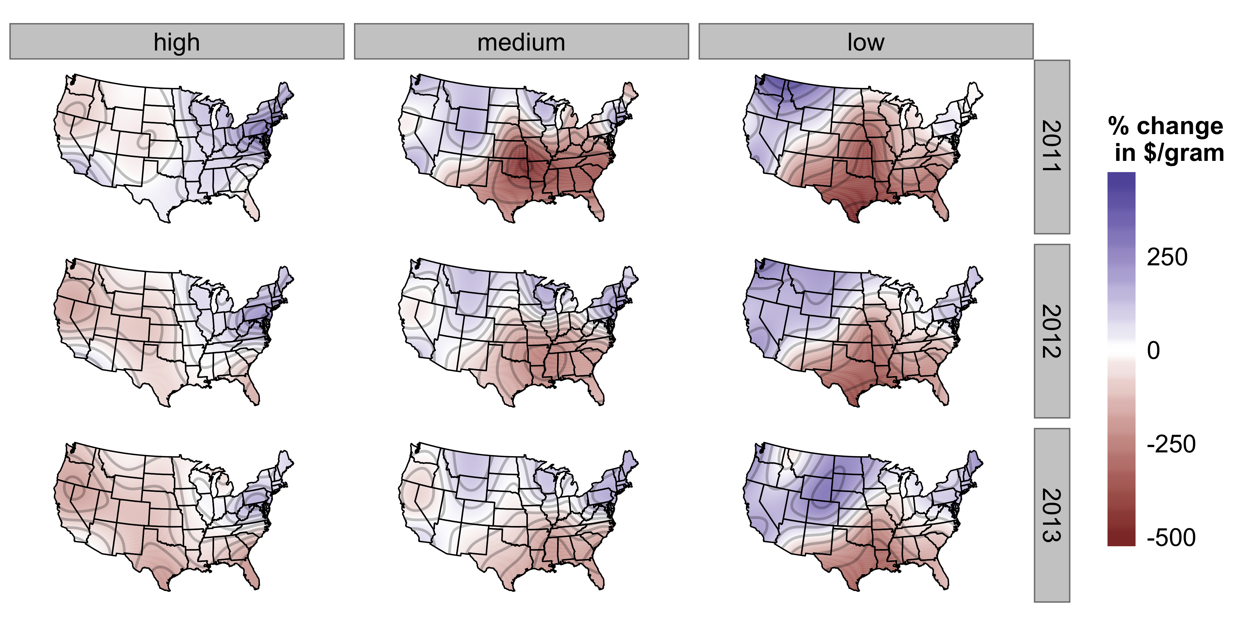 Another problem is the obvious SUTVA violation that results from arbitrage. If a change in retail enforcement in Connecticut decreased price we would expect the price in neighboring states to go down as well (as has obviously been the case with California). NPR did a planet money episode on a marijuana dealer who smuggles marijuana from California to New York City to exploit exactly this sort of price differential. The only thing preventing arbitrage from making prices uniform are transaction costs. By using some splines (a tensor product of thin-plate splines, using Simon Wood's mgcv package) I was able to show that the price gradient changes over time, space, and by marijuana quality. Making any sort of claim about why the price gradient has changed, however, doesn't really seem possible. Since trafficking patterns likely change in response to changes in state level legality, smoothing over space and time is controlling for a post-treatment variable (though there are probably some aspects of trafficking patterns that are confounders rather than effects of changes in legal status).